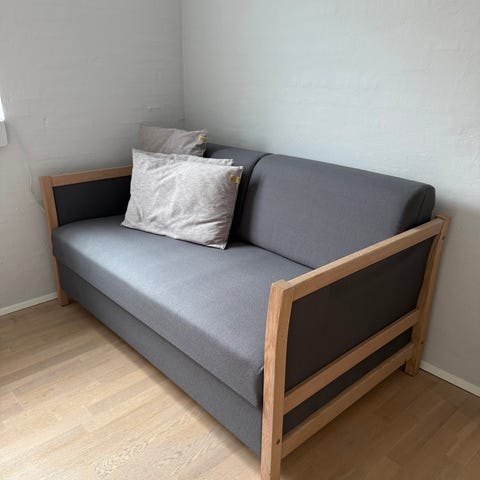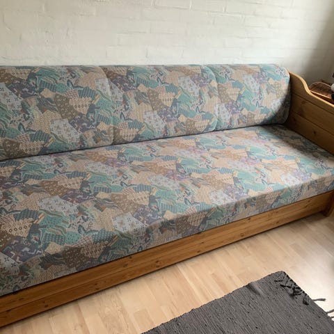 Træstellet står helt fejlfrit, men polstringen trænger til fornyelse. Sovebredde ca 110 cm når den er slået ud.