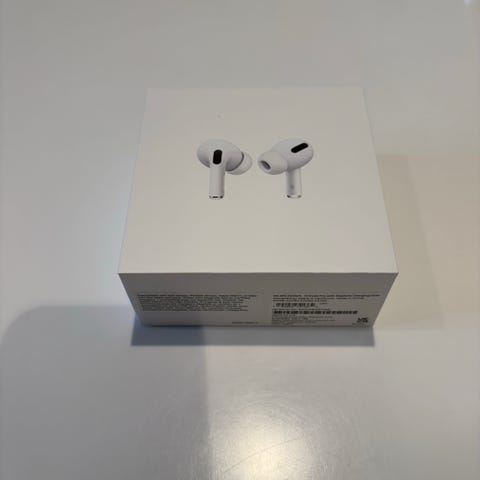 Apple AirPods Pro høretelefoner, trådløse in-ear hovedtelefoner i hvid. Modellen leveres med aktiv støjreduktion og silikone-eartips i flere størrelser for bedre pasform. Opladningsetui med Lightning-stik medfølger sammen med opladningskabel og dokumentation. Velegnet til brug med Apple-enheder via Bluetooth-tilslutning.