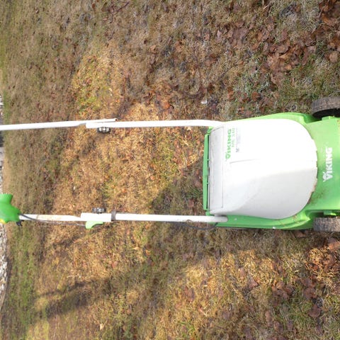 Velholdt Viking plæneklipper med benzindrevet motor og 46 cm klippebredde. Plæneklipperen har fire hjul og håndtag med bøjlegreb. Kabinettet er i grøn farve med sort motorhus. Den har fået fuld service og virker som ny. Den er med træk og 55 liter græsopsamler, samt justerbar klippehøjde. Velegnet til klipning af græsplæner i private haver. Nypris ca 5000 kr.