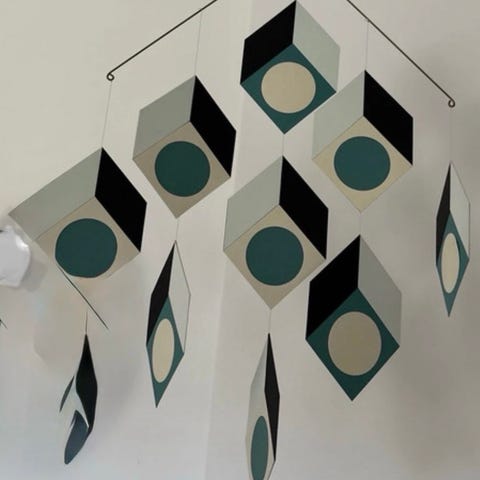 Dekorativ hængemobil bestående af 3 koncentriske metalringe og en mørkegrøn kugle i midten. Ringenes enkle, cirkulære form giver et geometrisk udtryk, og mobilen kan hænges op i loft eller vindue. Velegnet som ophæng til stue, kontor eller andre rum, hvor der ønskes et roligt, skulpturelt element i indretningen.