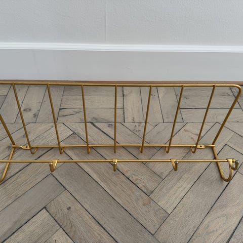 Enkelt og stilfuld hattehylde i sort jern, med 16 messing stænger som overhylde.