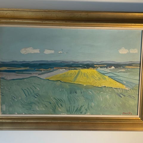 Axel P. Jensen maleri, landskab med huse olie på lærred
