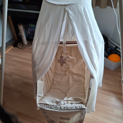 Slyngevugge, motor og White noise kommer i original emballage med tilhørende transport poser og en ekstra karabinhage, der aldrig har været brugt.