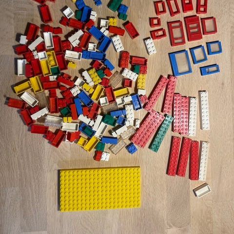 LEGO blandet parti klodser i forskellige størrelser og former. Overvejende røde, hvide og grå elementer samt enkelte gennemsigtige og farvede dele. Indeholder blandt andet almindelige klodser, plader, lange bjælker, vinduesrammer og små specialelementer. Egnet som supplement til eksisterende LEGO-samling eller til fri byggeleg.