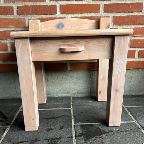 Vintage sengeborde i fyrretræ med skuffer. De har en smule aldersrelateret patina i form af lakering er slidt et par steder, men stadig absolut fine. Skufferne kører perfekt.
