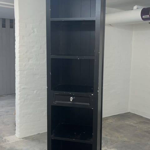 Slank og moderne reol i sort metal med flere hylder, som giver god opbevaringsplads til bøger, opbevaringskasser eller dekoration.