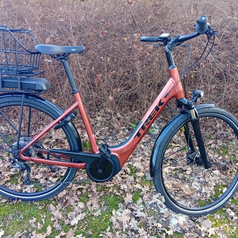 Trek elektrisk cykel i blå i stelstørrelse M med 27,5" hjul. Cyklen har lav indstigning og er udstyret med centermotor fra Bosch og integreret batteri i stellet, med hydrauliske skivebremser for og bag samt dæmpet forgaffel og sadelpind for komfort. Der er fastmonteret bagagebærer og skærme samt integreret for- og baglygte. Farven er mat blå, og har et par brugsspor i lakken på kronrør og sadelrør, men uden betydning. Velegnet som pendler- og hverdagscykel i by og på landevej. Cyklen er omtrent 1 år gammel, og original kvittering medfølger, samt forsikringgodkendt lås dobbeltlås som også fremgår af kvittering. OBS! Trek sadeltasker medfølger ikke i køb men kan tilkøbes hvis ønsket.