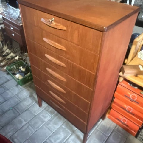 Flot teak kommode med spejllåg og lys. Der er enkelte mindre skader, som er vist på billederne.