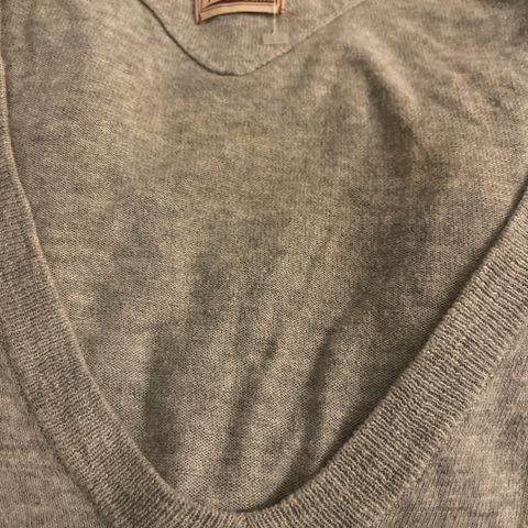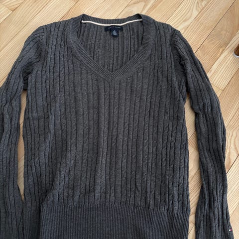 Tommy Hilfiger sweater til dame i størrelse L. Sweateren er grå og fremstillet i bomuld. Modellen har lange ærmer og v-udskæring. Velegnet som hverdagsstrik eller til lag-på-lag outfits.
