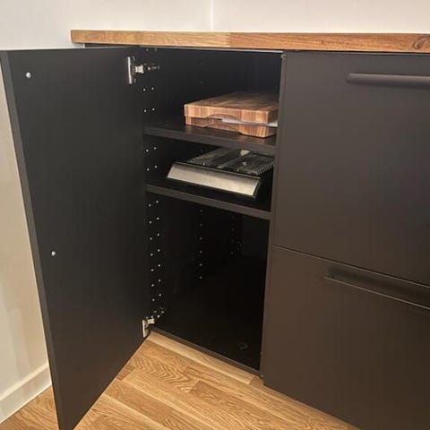 Øen står på ben med metalfødder. Egnet som ekstra arbejds- og opbevaringsplads i køkken eller alrum, med god plads i både skuffer og skab.