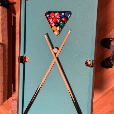 Billardbord med grøn filt og træramme. Bordet står på et spisebord og kan bruges som flytbart billardbord. Der medfølger to billardkøer, billardkugler, trekant til opstilling af kugler samt kegler til keglebillard. Velegnet til indendørs brug i hjemmet, f.eks. i stue eller spilleområde.målene 100 cm x 190 cm