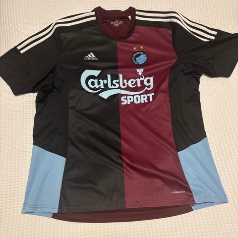 Adidas F.C. København fodboldtrøje i sort og blå med røde detaljer på skuldrene. Trøjen har FCK-klublogo på brystet, Adidas-logo og DBU-mesterbadge foran samt 3F Superliga-mærke og Carlsberg-logo på ærmerne. Let og åndbar polyesterkvalitet egnet til fodbold og anden sport. Velegnet som kamp- eller træningstrøje for F.C. København-tilhængere.