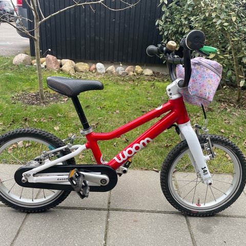 Woom børnecykel med 14" hjul i rød og hvid. Cyklen har lige styr og justerbar sadelpind. Udstyret med kædeskærm, skærme for og bag, håndbremser og reflekser. Velegnet som første cykel til børn, der skal lære at cykle på en let og overskuelig cykel med små hjul.