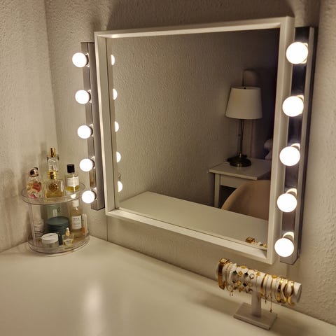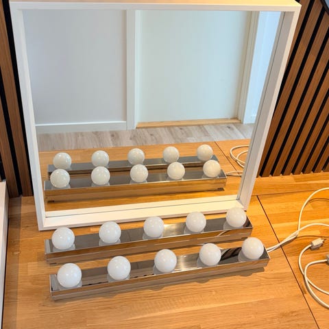 IKEA Lettan spejl 60x95 med lys langs siderne. 2 “skinner” (Ledsjø, Ikea) med integrerede pærer monteret lodret på begge sider af spejlet. Bemærk 1 pære defekt. Velegnet som makeup- eller badeværelsesspejl, hvor der er behov for jævn belysning omkring ansigtet. Monteres på væg over bord eller vask efter behov. Samlet nypris ca 1000 kr (2x395 og 1x195)
