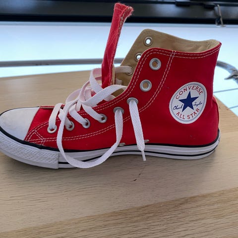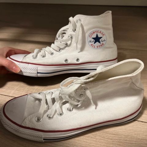 Converse All Star sneakers i sort med hvid sål og hvide snørebånd. Klassisk høj model i lærredstekstil med gummisål. Størrelse 43. Velegnet som hverdagssko og fritidssko. Velegnet til både mænd eller kvinder