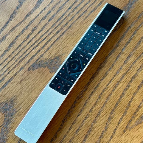 Bang & Olufsen BeoRemote One BT fjernbetjening i sølvfarvet metal med sort front.