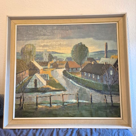 Maleri af Allan Karm, der måler 81x50 cm med ramme. Uden ramme måler maleriet 64x32 cm