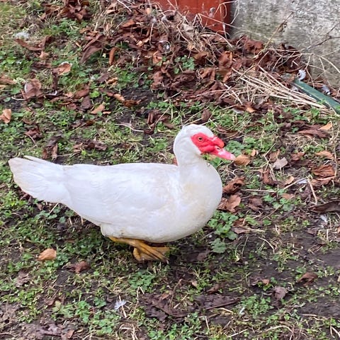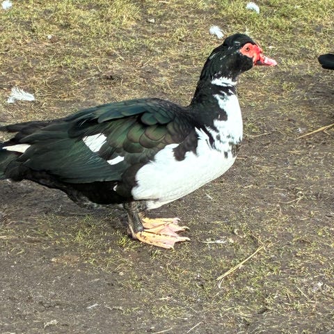 Moskusand i sort og hvid fjerdragt. Fuglen har mørke, næsten sorte vinger og ryg med grønlig glans samt hvid bryst- og halsregion. Hovedet er hvidt med røde hudpartier omkring næbbet. Egnet som fjerkræ til have eller mindre landbrug, hvor der er behov for en robust andetype.