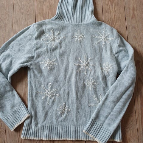 Benetton rullekrave sweater til kvinder i størrelse M. Sweateren er i uld og har sort grundfarve med argyle-mønster foran i røde og mørke nuancer. Velegnet som varm hverdagssweater eller som lag-på-lag i køligere vejr.