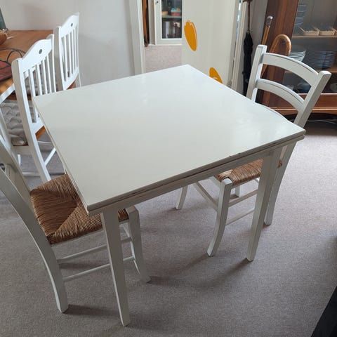 Sættet er originalt i mørkt træ, men er blevet malet for fem år siden (bordet hvidt, stole beige).