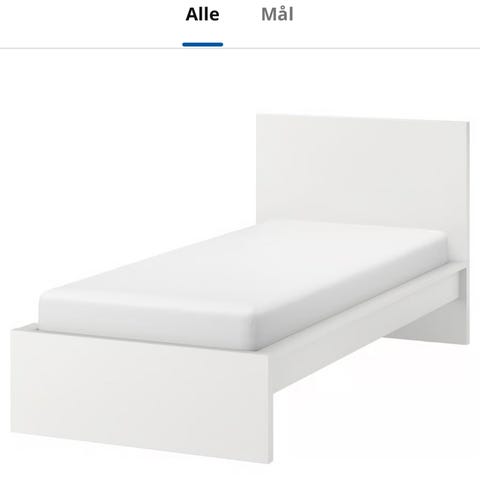 IKEA seng med sengebund i hvid. Sengen har integreret lamelbund og hovedgavl. Rammen er udført i et lyst materiale med glat overflade. Velegnet til brug i soveværelse som almindelig seng. Madrasser medfølger ikke ud fra det viste billede.