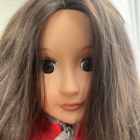 Dukken har i legen fået “neglelak” på tæerne, og en lille tot hår er klippet af foran i venstre side (fotos).