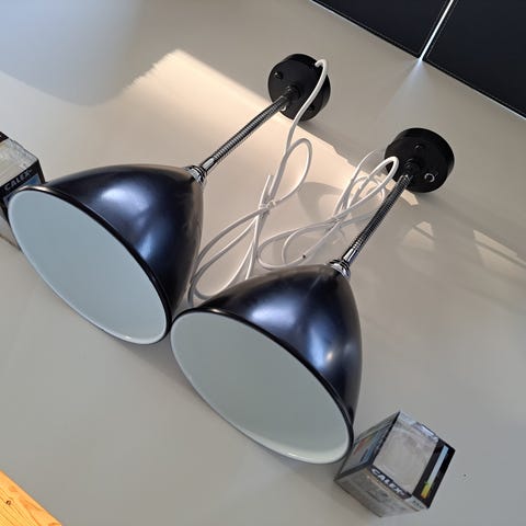 Helt nye Gong væglamper i sort og mæssing. Super flotte og ubrugte/uåbnede. Vi kan ikke få plads i hjemmet. Se specifikationer her https://www.gong.co.uk/gc-010-peggy-wall-lamp-brass/