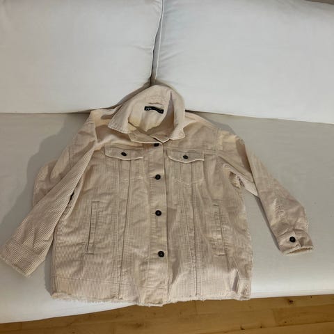 Den er oversize så nok mere en 38 end 34, som en str. M kan man sagens have en tyk trøje inde under. Den er let forret så rigtig god i overgangessæsoner og en sommer aften.