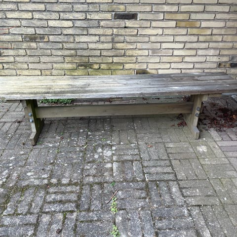 Havebænk i træ med hynder i lys grå