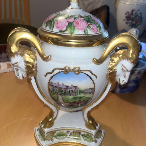 Porcelæn dekoreret med roser, bronze samt marmorbase.