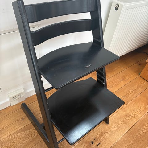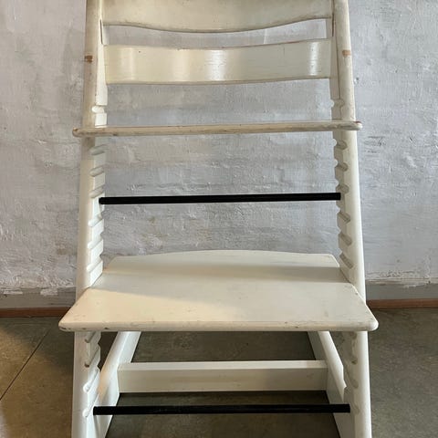 Stokke Tripp Trapp højstol i hvidmalet træ. Højstolen har justerbar siddeplade og fodplade, som kan tilpasses barnets højde. Designet gør det muligt for barnet at sidde ved spisebordet sammen med resten af familien. Velegnet som børnestol fra småbørnsalderen og op gennem barndommen. Klassisk Tripp Trapp-konstruktion med stabile meder og ryglæn for støtte.