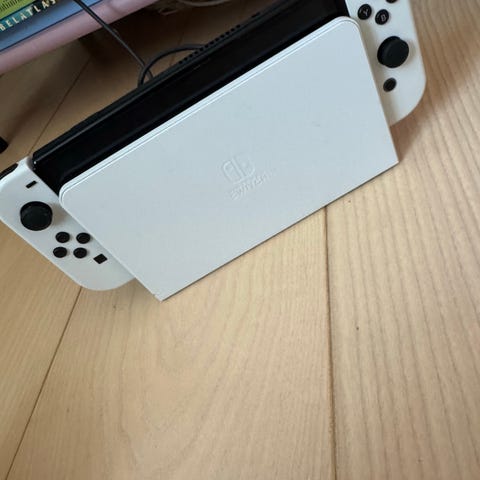 Konsollen har aftagelige Joy-Con controllere i hvid samt tilhørende dock i matchende farve. Der medfølger strømadapter, som ses på billederne. Switch OLED-modellen har indbygget skærm, der kan bruges håndholdt, samt mulighed for tilslutning til tv via docken. Egnet til både håndholdt spil, bordspil med støttefod og stationær brug gennem docken.