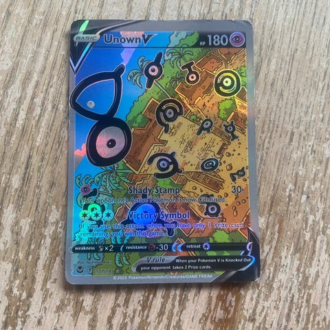 Pokémon Unown samlekort med angrebet Hidden Power. Kortet viser Unown-figuren og er et Psychic-type Pokémon-kort. Velegnet til samling eller som del af et Pokémon-kortspil.