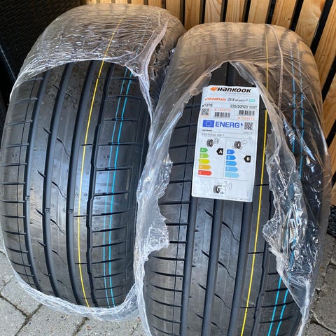 Dækkene kom monteret på ny bil og blev udskiftet til helårsdæk, hvor de har kørt ganske få km.