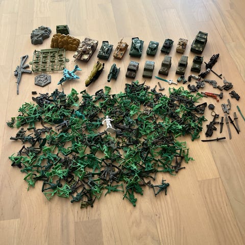 Dekorative figurer forestillende Gøg og Gokke i uniform. Figurerne står på en fælles fodplade og bærer grønne uniformer med hat og støvler. De holder hver især et gevær og har detaljer som bælter og udstyr på ryggen. Egnet som pynt eller samlerobjekt til udstilling i hjemmet. Desværre har Gokke mistet hans granater, men kom med et bud