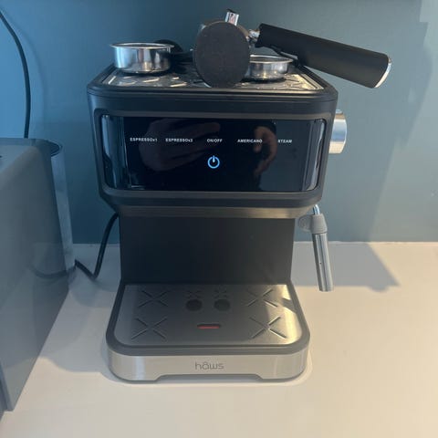 HÂWS espressomaskine i sort med frontpanel i glas/plast. Maskinen har aftagelig vandtank og aftagelig drypbakke. Medfølgende tilbehør omfatter portafiltere, filtre/indsatser samt måleske/tamper. Egnet til brygning af espresso og kaffedrikke i hjemmet. Manual medfølger ifølge billederne.