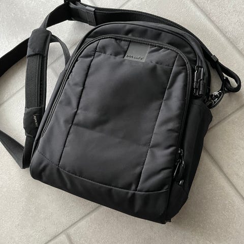 Pacsafe unisex taske i polyester en tyverisikret taske mål 23x16x6. Tasken er i sort og har lynlåslukning samt yderlomme med lynlås på forsiden. Velegnet som mindre skulder- eller crossbodytaske til rejse-festival brug for både mænd og kvinder. Tasken har justerbar rem og flere rum til opbevaring af personlige ejendele som telefon, pung og nøgler. Sender gerne mod porto