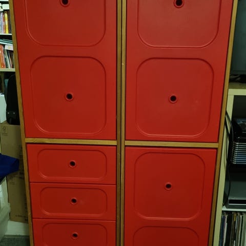Sødt tøjskab til børneværelse, fylder ikke så meget i højden. Låger med bøjlestand, opbevaringsrum og stor skuffe. Fremstår som nyt uden slid.