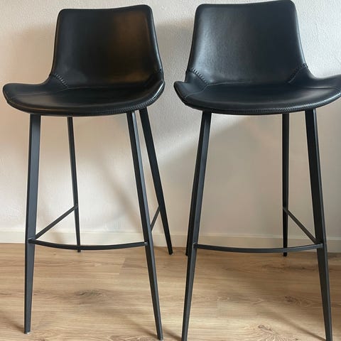 2 elegante Dan-Form Hype barstole i sort læderlook med sorte metalben. Et virkelig flot og tidløst dansk design.