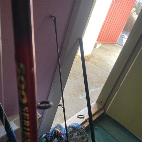6 stænger, 2 hjul, diverse blink, kroge, fluer, liner etc. det hele sælges samlet.
