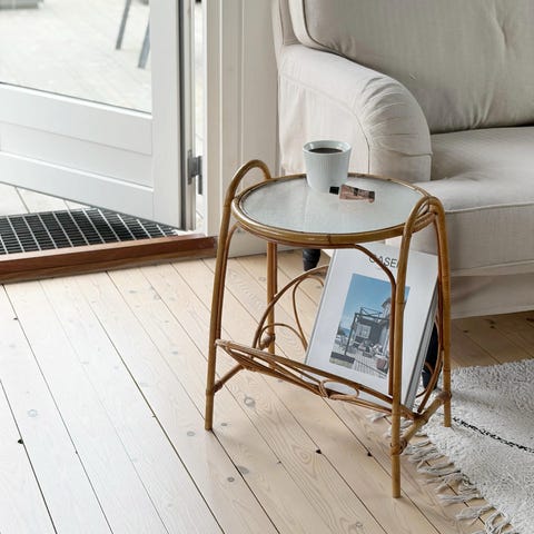 Rundt bambusbord med glasplade.