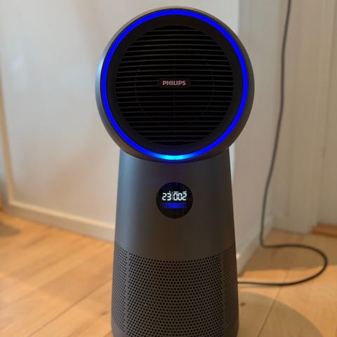 Philips luftrenser i cylindrisk design. Enheden er sort og har luftindtag i bunden og udblæsning i toppen. Velegnet til indendørs brug til filtrering af luften i mindre rum. Strømtilslutning i bunden/bagsiden og betjening på toppen af enheden.