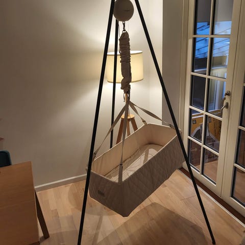 Der medfølger stativ, motor, vugge, sengehimmel og vandtæt madrasbeskytter (uden uheld).