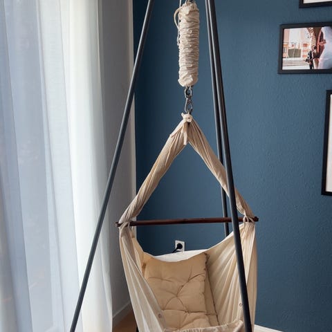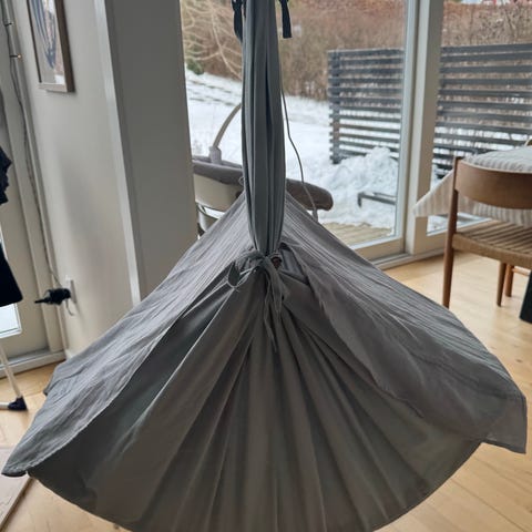 Købt juli 2025 og står flot uden brugsspor, bortset fra et lille hul i stofposen rundt om fjederen. Denne kan købes fra ny til 25 kr..