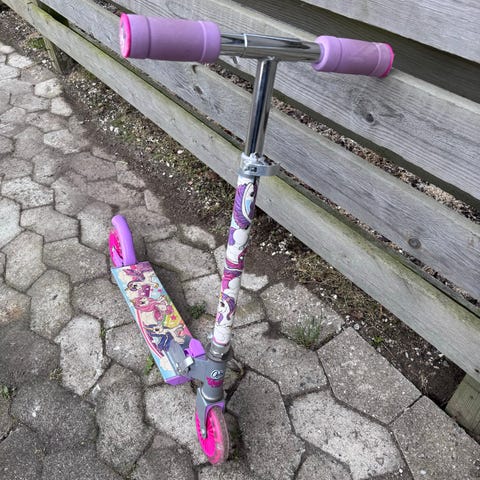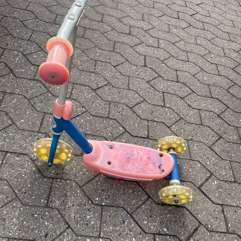 Blåt løbehjul med lys i de forreste hjul.