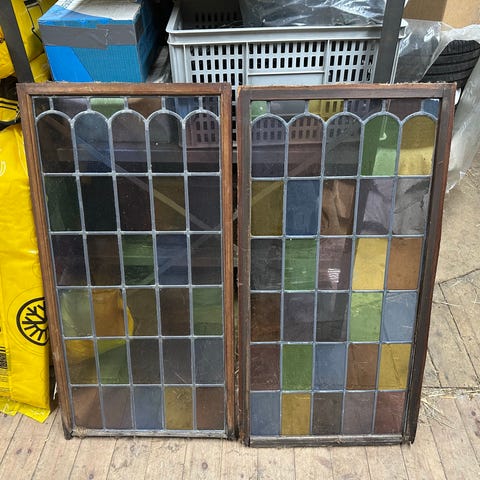 Rektangulært glasvindue med flerfarvede, vandrette glasfelter i struktureret glas. Vinduerne er monteret i en malet træramme. Egnet til brug som vinduesparti, dekoration eller indbygning i dør- eller vægåbning, hvor der ønskes lysindfald med afskærmet indkig. Flere farvenuancer i glasset, blandt andet grønne og brune toner.