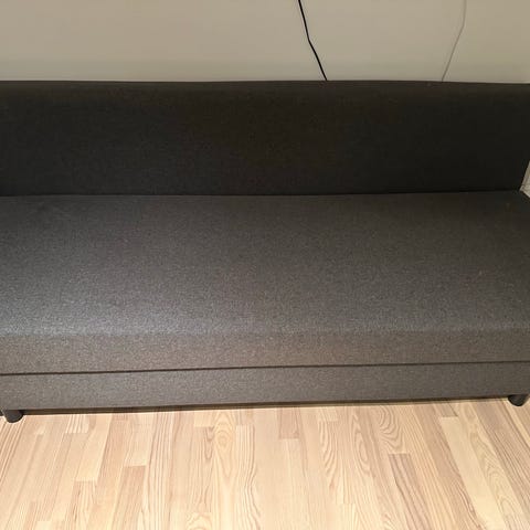 Sofaen er i brugt, men rigtig fin stand. Den er kompakt og stilren i hverdagen, men forvandles lynhurtigt til en seng, når der er overnattende gæster.