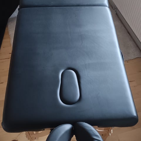Sammenklappelig massagebriks med sort polstring i kunstlæder og indbygget ansigtshul. Briksen har træben og træramme med wire-forstærkning for stabilitet. Der er bærehåndtag i enden, så briksen kan transporteres lettere. Velegnet til massage, behandlinger eller afslapning i hjemmet eller klinikmiljø.