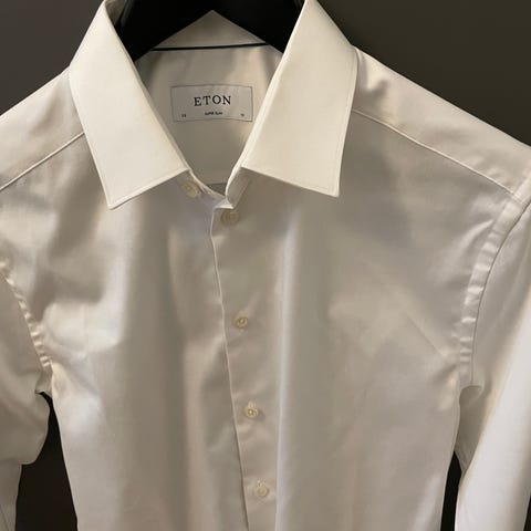Eton herre skjorte i størrelse M (38/15) slim. Klassisk hvid skjorte i bomuld med lange ærmer, knaplukning foran og almindelig krave. Skjorten egner sig til både formelle og uformelle anledninger og kan bruges med jakkesæt eller alene med bukser eller jeans.