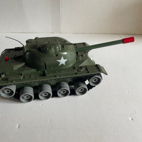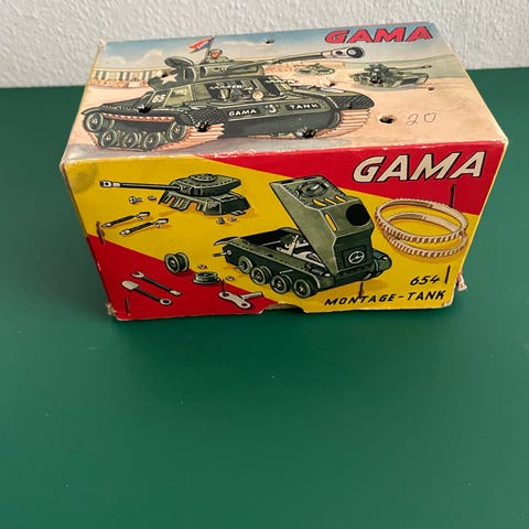 Ældre tank fra tyske GAMA "made in Western Germany" i utrolig flot stand. Batteridrevet fjernstyring, som virker fint. ca. 30 cm. lang m. kanon og 10 cm. bred.